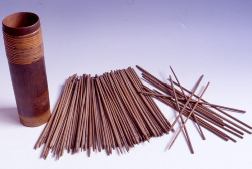 점을 칠 때 산통을 대여섯 번 흔든 다음 산통을 거꾸로 들면 그 구멍으로 산가지가 나옵니다.